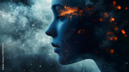 A surreal profile of a human face blending into cosmic elements, with glowing fiery neurons. human thought, imagination, and the vastness of the cosmos, creativity, and the mysteries of the human mind