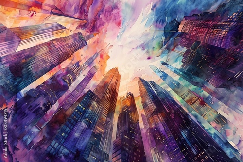 A surreal scene of towering skyscrapers intertwined with haunting poetry verses, from a high-angle view. Watercolor techniques to create a dreamlike quality