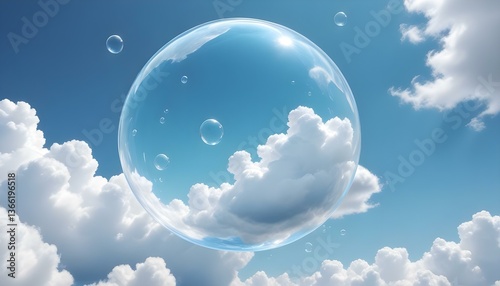 A surrealistic digital artwork featuring a large, transparent bubble containing a cloud, surrounded by smaller bubbles