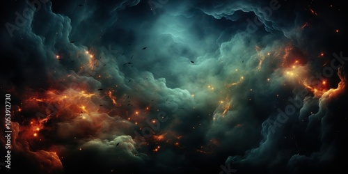 A swirling cosmic nebula, with deep blue and green clouds lit by bright, fiery orange stars.