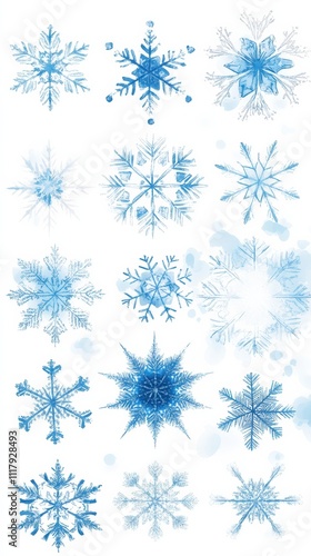 A Symphony of Snowflakes: An artistic display of diverse snowflakes, captured in all their delicate glory, showcases the unique beauty of each frozen water crystal in an icy embrace
