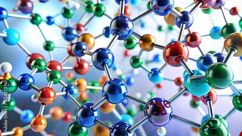A symphony of vibrant spheres interconnected by metallic rods, forming a captivating abstract structure with a subtle blue background.