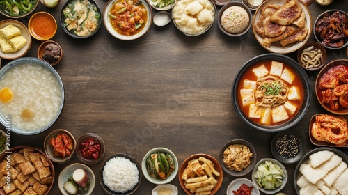 A table filled with traditional Korean New Year foods like tteokguk (rice cake soup), with space for text in the middle.