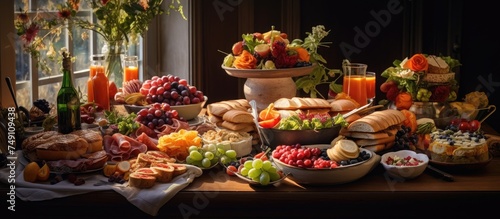 A table overflowing with an assortment of snacks, sandwiches, and dishes, all meticulously arranged for a festive occasion. The spread includes a diverse selection of savory and sweet items, creating