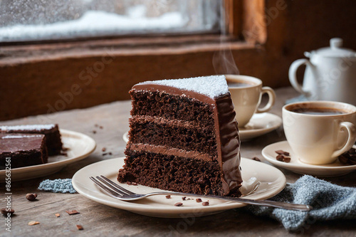 A table served for a tea party with a piece of appetizing chocolate cake on a plate. A snowy window in the background. AI generative.
