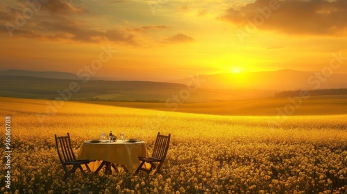 A table set for two in a field of yellow flowers