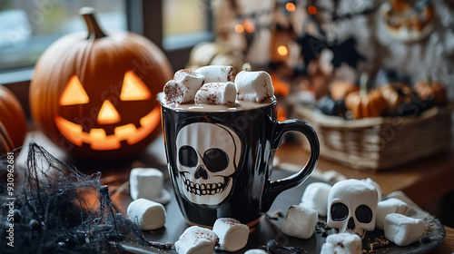 A table set with a cup of hot chocolate, marshmallows shaped like skulls, and Halloween decorations such as bats, cobwebs, and a jack-o-lantern