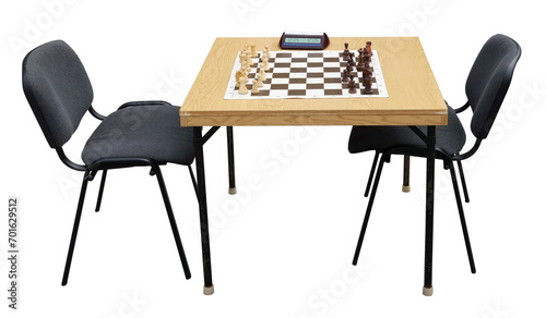 A table with a chessboard and chess timer isolated