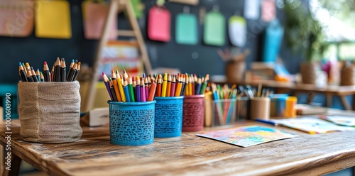 A table with various colorful pencils in different containers, with a colorful painting on the table.