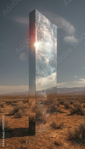 A tall rectangular mirror stands in the middle of an open field with high mountains and grass, reflecting a vast sky.
