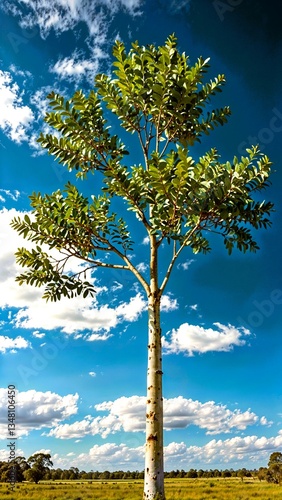A tall tree with green leaves against a blue sky with white clouds. The tree is situated in a field.