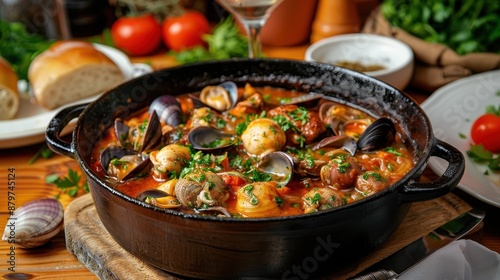 A tantalizing seafood soup, with an array of shellfish simmered in a rich broth, garnished with fresh herbs, served in a black cast iron pot on wooden table.