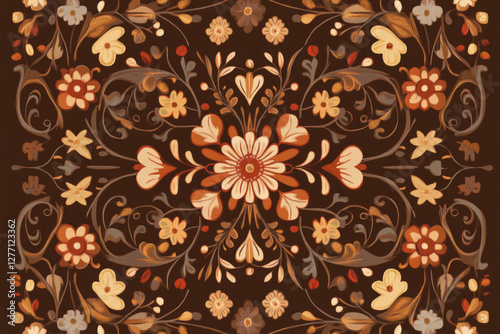 A tapestry-like vintage background with intricate embroidery patterns, warm earthy tones, and ornate floral designs.