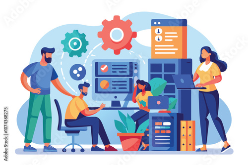 A team assists with computer software installation while engaging in problem-solving activities together, IT support fixing computer software installation, flat illustration