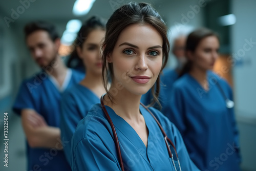 A team of doctors gathered together in a hallway, ready to provide medical care and expertise.