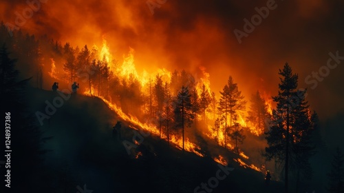 A team of firefighters battling a forest fire in the mountains, using water to control the flames. The fire threatens the surrounding trees and wildlife as the team works to stop its spread.