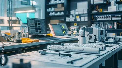 A tech-driven product development room with advanced computing equipment, design blueprints, and prototype models laid out on workbenches.