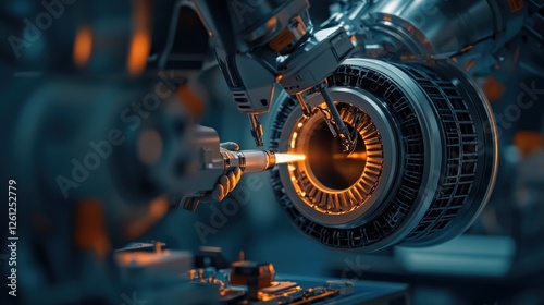 A technician performing a 3D scan of a jet engine component, futuristic quality control process, glowing scanning laser