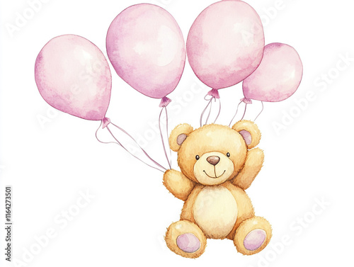 A teddy bear is holding a bunch of pink balloons. Watercolor style.