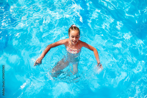 A teenage girl of 11-13 years old swims in a pool with blue water. She has african braids braided with zi-zi ribbons. Summer. Family vacation.