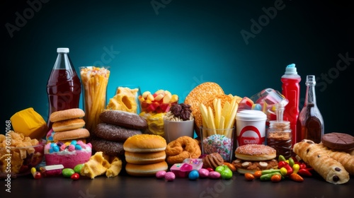 A tempting collection of various junk foods and snacks, highlighted by a moody and dark background