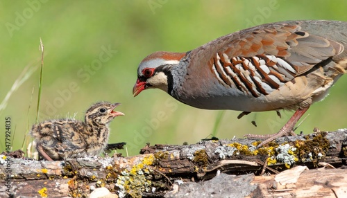 A tender moment: Red-legged partridge and its young chick on weathered branch