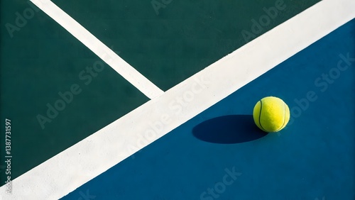 A tennis ball on a court during a match with a racket, net, and green lines.