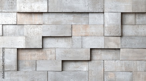 A textured, grey concrete wall showcasing an abstract arrangement of various rectangular panels with distinct patterns.