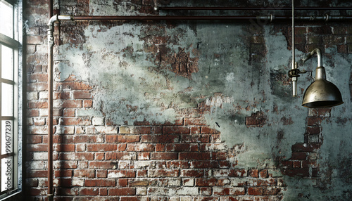 A textured wall with exposed bricks, metal pipes, and raw concrete, offering a modern, urban, and gritty aesthetic