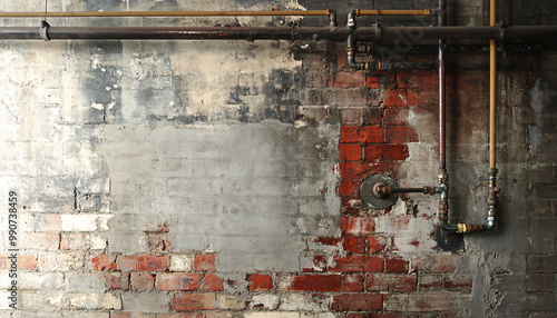 A textured wall with exposed bricks, metal pipes, and raw concrete, offering a modern, urban, and gritty aesthetic