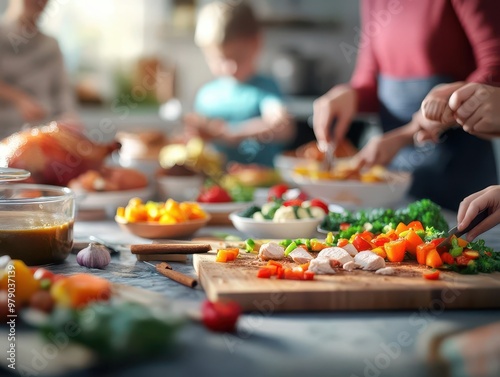 A Thanksgiving kitchen bustling with activity people chopping vegetables
