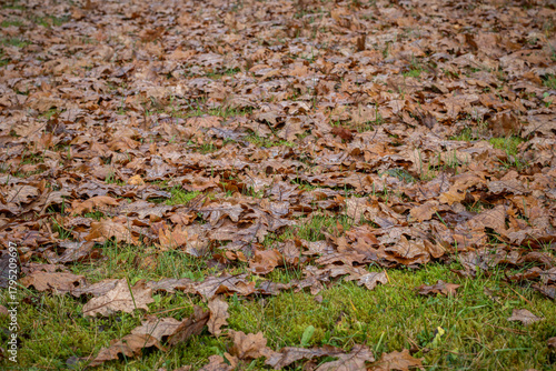 A thick layer of rain-soaked oak leaves covers vibrant green moss and grass, creating a rich autumn texture on the forest floor.