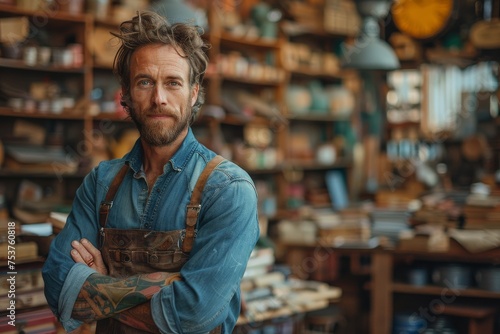 A thoughtful artisan with tattoos stands with crossed arms in a well-stocked woodworking shop