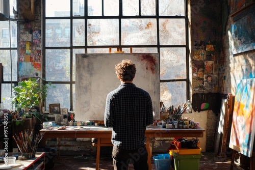 A thoughtful artist stands in the studio gazing at a blank canvas. Natural light flows through large windows. This creative environment inspires imagination. Generative AI