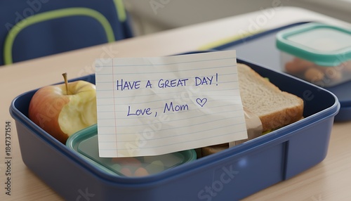A thoughtful handwritten note from Mom wishing 'Have a great day!' placed inside a child's lunchbox with a sandwich and an apple.
