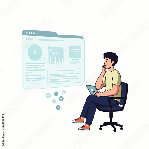 A thoughtful person analyzes digital data and programming on a transparent screen, engaged in problem-solving using a laptop, embodying modern digital work.