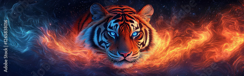 A tiger with neon, swirling stripes that melt into the psychedelic background. The animal's eyes glow with electric blue energy