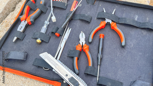 A tool kit with a variety of tools including pliers, scissors, and wrenches. The tools are organized in a pouch and are ready for use