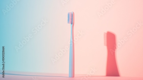 A toothbrush with a long shadow on a colorful background.