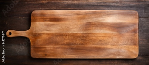 A top down view of a rectangular vintage style cutting board with a handle and a wooden spoon The image features empty space for copy or other elements