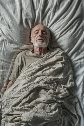 A top down view of an elderly male man laying flat on a bed in a hospital with face facing up and eyes closed. The concept of death