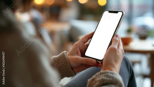 A top view of a woman sits indoors and holds a smartphone with a white screen mockup.