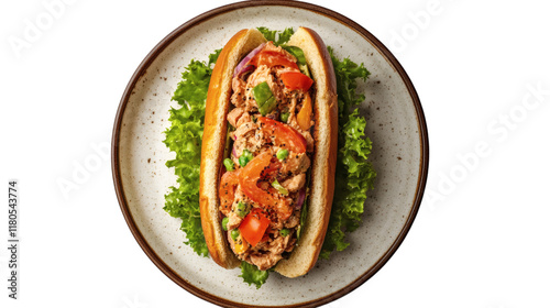 A top view of zinger burger in the plate isolated on white background
