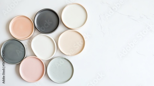 A top-view image of artisanal ceramic coasters in soft pastel colors on a white background.--ar 16:9