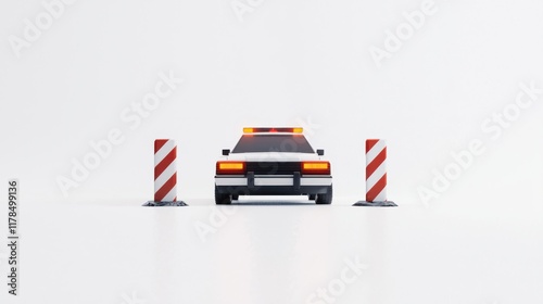 A toy car is positioned between two traffic cones, set against a simple white backdrop, emphasizing a minimalistic design.