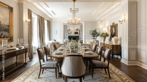 A traditional dining room with a large wooden table, classic chairs, and a chandelier for elegant dining --ar 16:9 --style raw Job ID: 8845c491-b021-4fa4-a279-3fba9a839c77