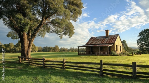 A traditional farmhouse surrounded by lush green grass, with a wooden fence and a large tree standing beside it under a bright blue sky