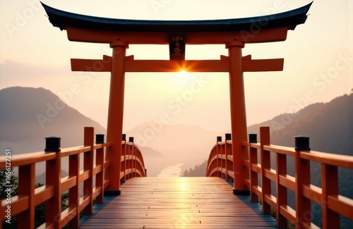 A traditional Japanese torii gate standing on a wooden bridge at sunrise with misty mountains in the background