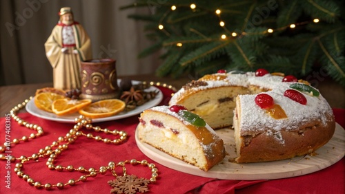 A traditional Spanish Roscón de Reyes decorated with candied fruits, powdered sugar, and almonds, displayed on a festive table with holiday ornaments. A classic treat for celebrating Epiphany.
