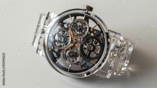 A transparent skeleton wristwatch, with visible gears and mechanical movement,